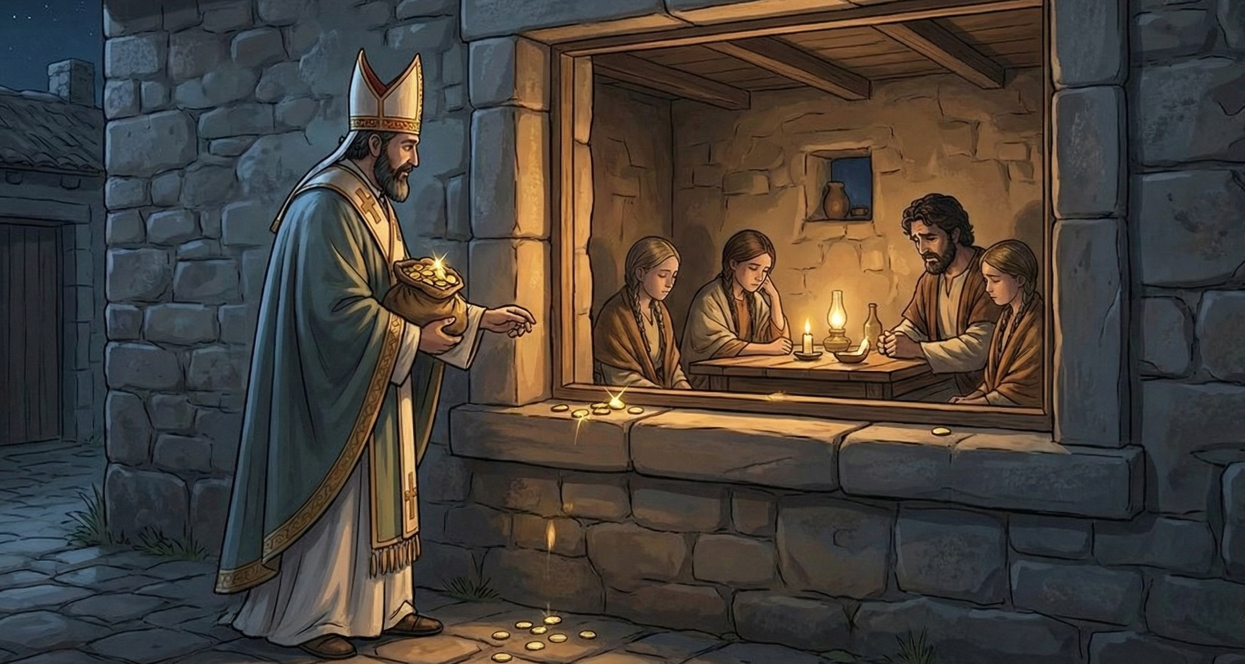 Yoksullara yardımseverliğiyle ünlenen Nikolaos’un en bilinen hikâyesi, fakir bir babanın kızlarını para karşılığı satmasını önlemek için geceleri gizlice pencereden altın keseleri bırakmasıdır. Bir rivayete göre ise pencerelerin kapalı olduğunu gören Noel baba para kesesini bacadan atar. Dünyaya hediye getiren, bacadan hediyeler atan Noel Baba figürünün kökeni tam da bu hikâyedir.