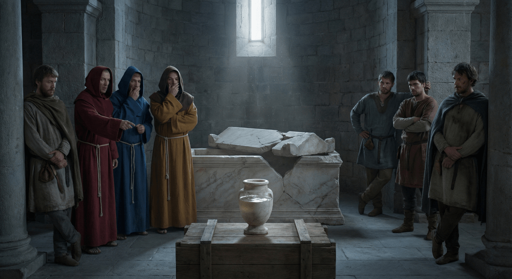 Mermer lahdi kırıp açtılar ve içinde mermer bir kavanoz buldular. Yarıya kadar temiz bir yağa benzer kutsal bir sıvıyla doluydu.