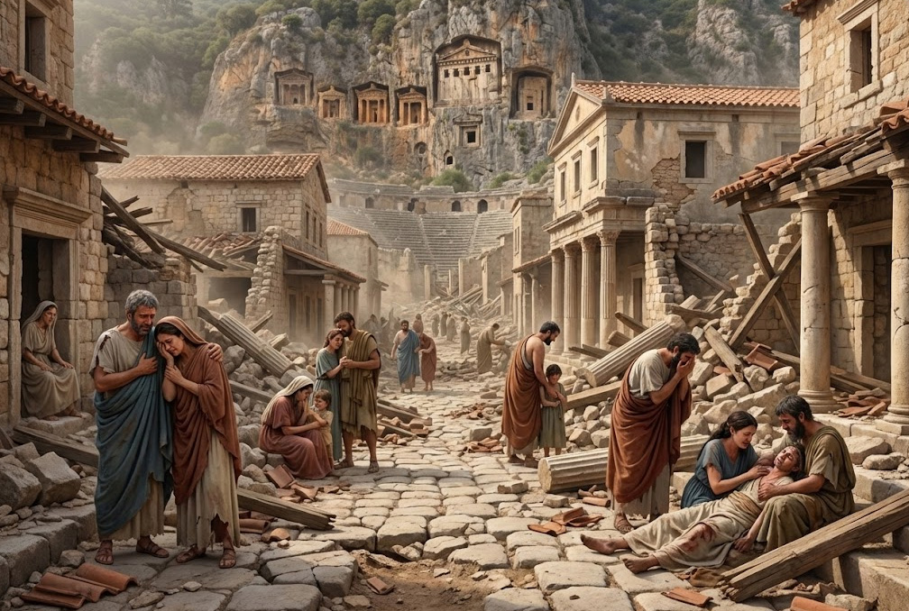 Nikolaos 49 yaşındayken 529 yılında büyük Likya depremi oldu, Likya’da taş taş üstünde kalmadı. Myra yeniden inşa edildi ama felaketler bitmedi. Depremden 13 yıl sonra başlayan veba salgını kenti kırdı geçti. Nüfus azaldı, tarlalar ekilemez oldu, ekonomi çöktü.