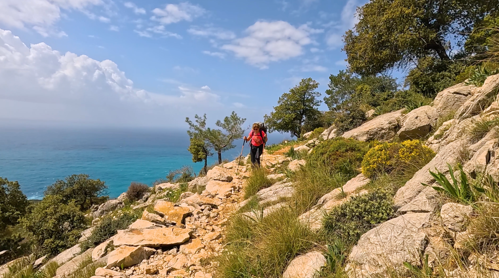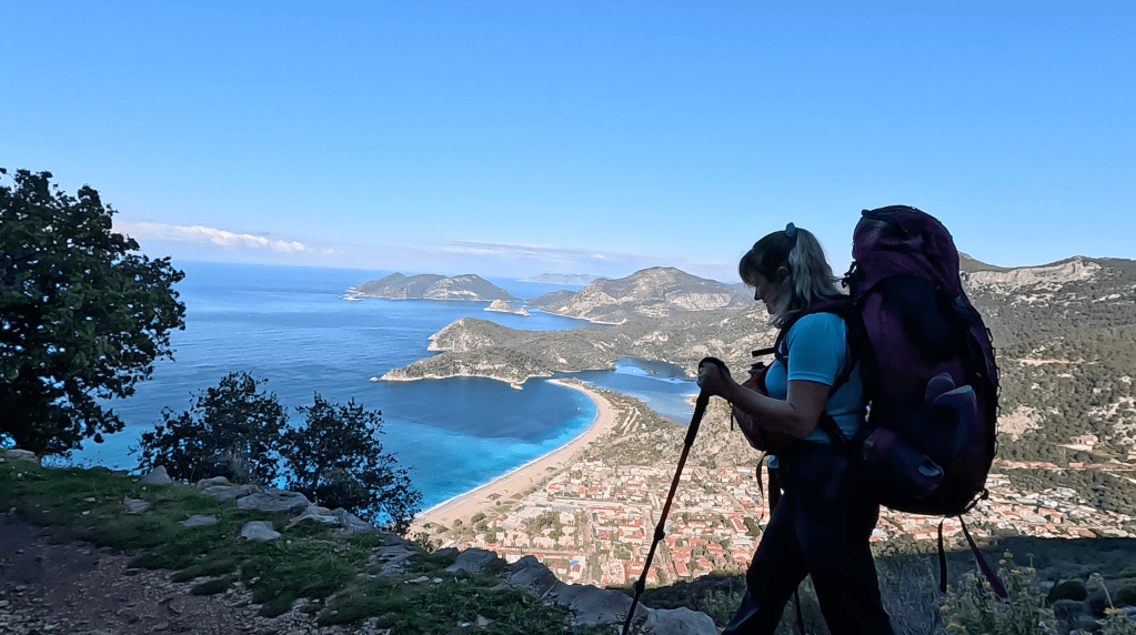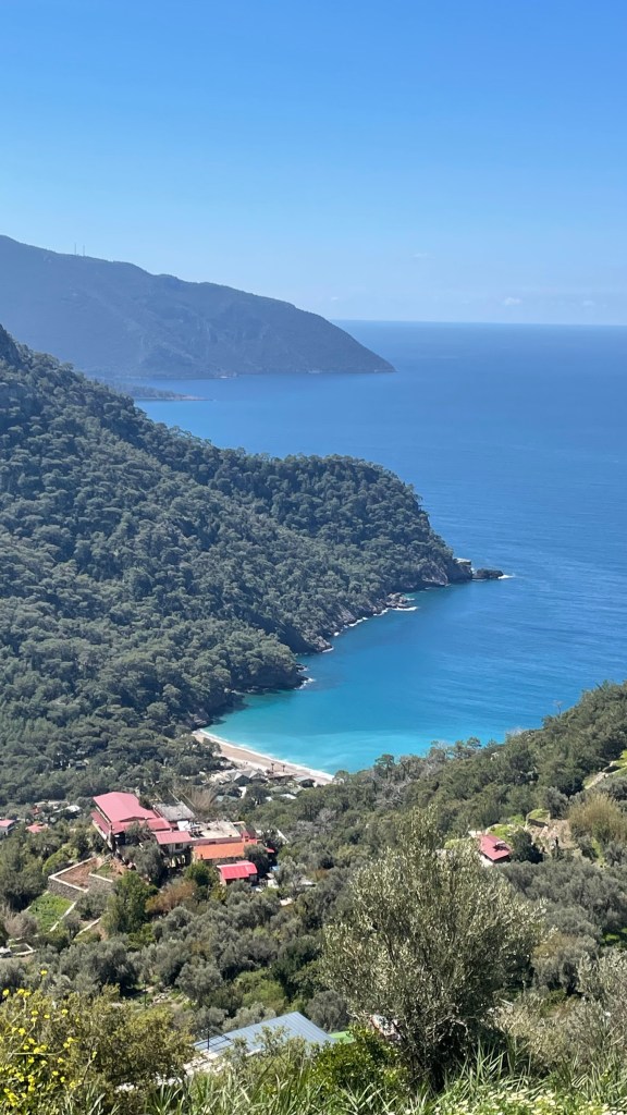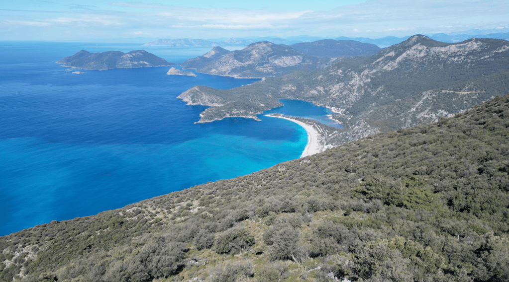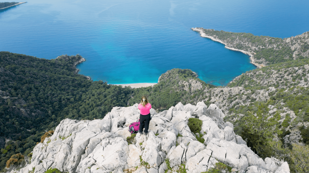 Patikadan yavaşça yükseldim, birkaç kilometre sonra Ölüdeniz ayaklarımın altına serildi. O harika manzarayı izlemek ve biraz soluklanmak için mola verdim. Henüz kimseyle karşılaşmadım. “İyi ki çıkmışım bu yola, iyi ki” diyorum kendime. Çok güzel hissediyorum. Çok güzel bir patikadan yürüyorum. Şöyle arkamda da Ölüdeniz manzarası. Oh, mis gibi. Kuşlar cıvıldıyor. Dün gece yağmur yağdı, toprak kokuyor. Pırıl pırıl bir gün. Harika gerçekten.