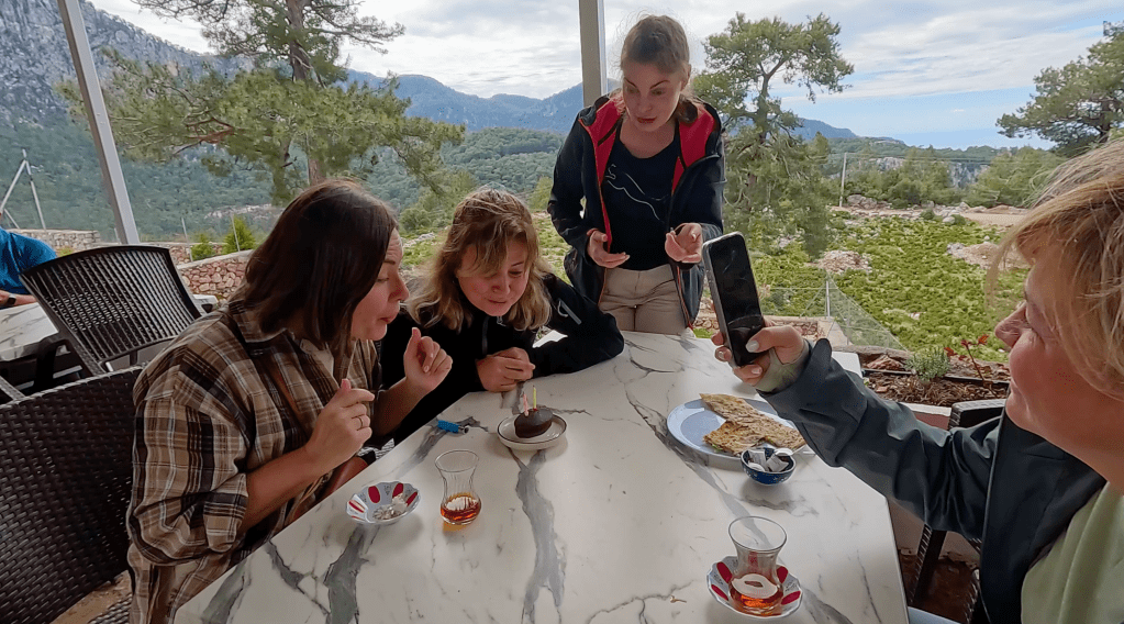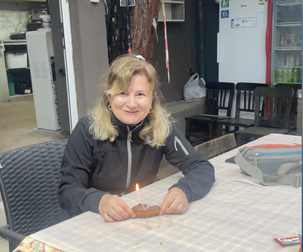 Sipariş ettiğim gözlemeyi yerken üç Rus kadın geldi. Sipariş ettikleri gözlemeler gelince bir anda “happy birthday” sesleri yükseldi. Meğer bugün aralarından birinin de doğum günüymüş. Ben de çantamdan top kekimi ve pastanedeki çalışanın fazla vermesi sonucu yanımda olan 2 mumu çıkardım. “Bugün benim de doğum günüm. Haydi beraber kutlayalım” dedim. Ve o anda anladım meğer diğer mumu Rus yürüyüşçü Margarita için onca yol taşımışım. Margarita da 46 yaşına girmiş bugün. “It is the best birthday” dedi Margarita. Sonra birbirimizi tebrik ettik ve ben tekrar yola düştüm.