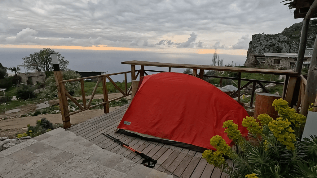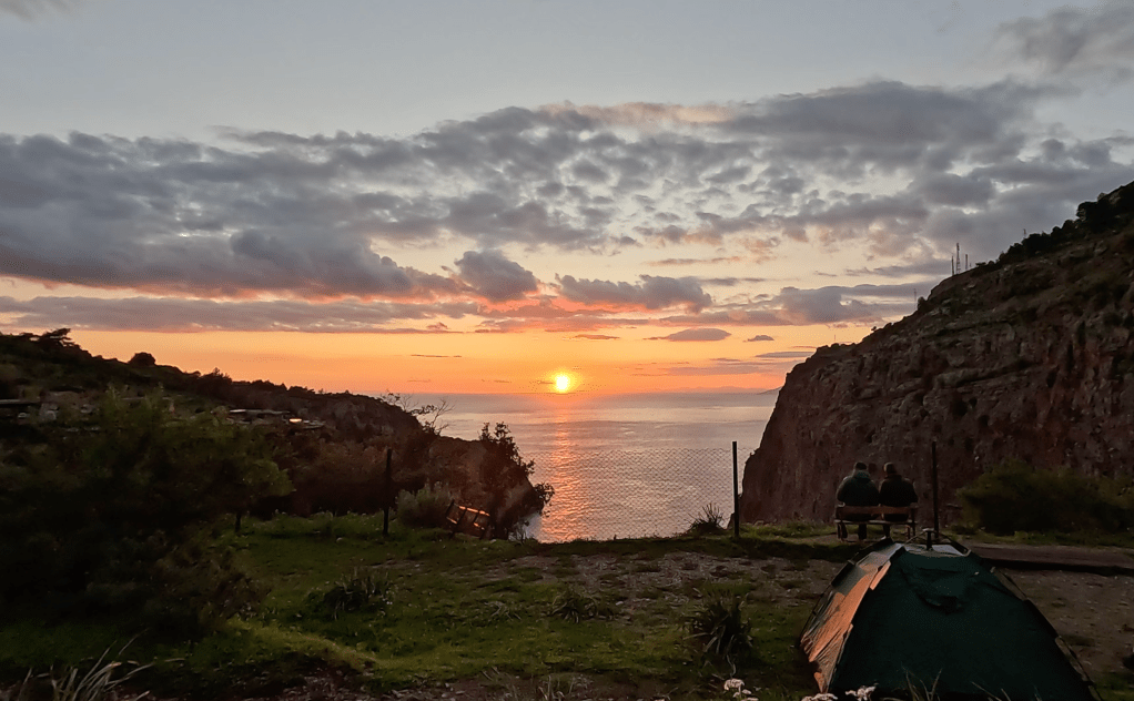 Kendime manzaralı güzel bir yer bulup çadırımı kurdum. Akşam yemeği için hazırlık yaparken yolda karşılaştığım insanlar gelmeye başladı kamp yerine. Akşam yemeğinde makarna ve tavuk yedim. Ardından da bir çay demledim kendime, bence ben bunu hak ettim. O harika gün batımını izlerken kamp yerindeki diğer yürüyüşçüler ile biraz sohbet ettim. Herkesin başka bir hikayesi var yolda olmak ile ilgili ama hepsinde ortak olan tek bir şey var. Yolda, doğada olmanın getirdiği o huzur, mutluluk ve dinginlik.