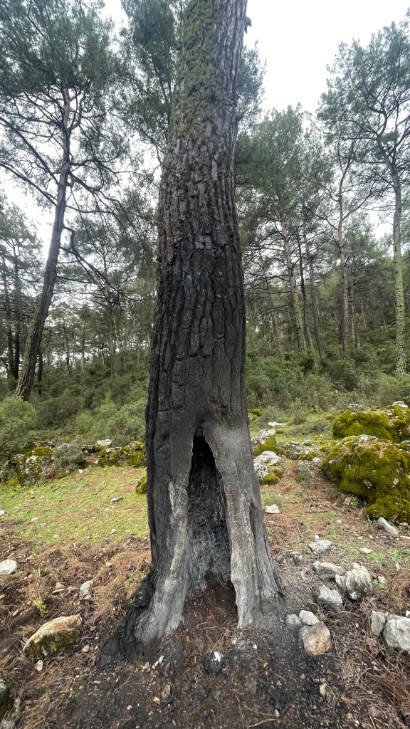 Bel’e 1,8 km kala için için yanan bir ağaçla karşılaştım. Beraber yürüdüğüm arkadaşlarla yanımızdaki suları ateşe döktük, toprak attık ama maalesef söndüremedik ağacı. Şükür ki gece yağmur yağmıştı ve yerler ıslaktı, yangın başka ağaçlara sıçramamıştı. Ben yangının yıldırım düşmesinden kaynaklandığını düşündüm önce ama maalesef öyle değilmiş.